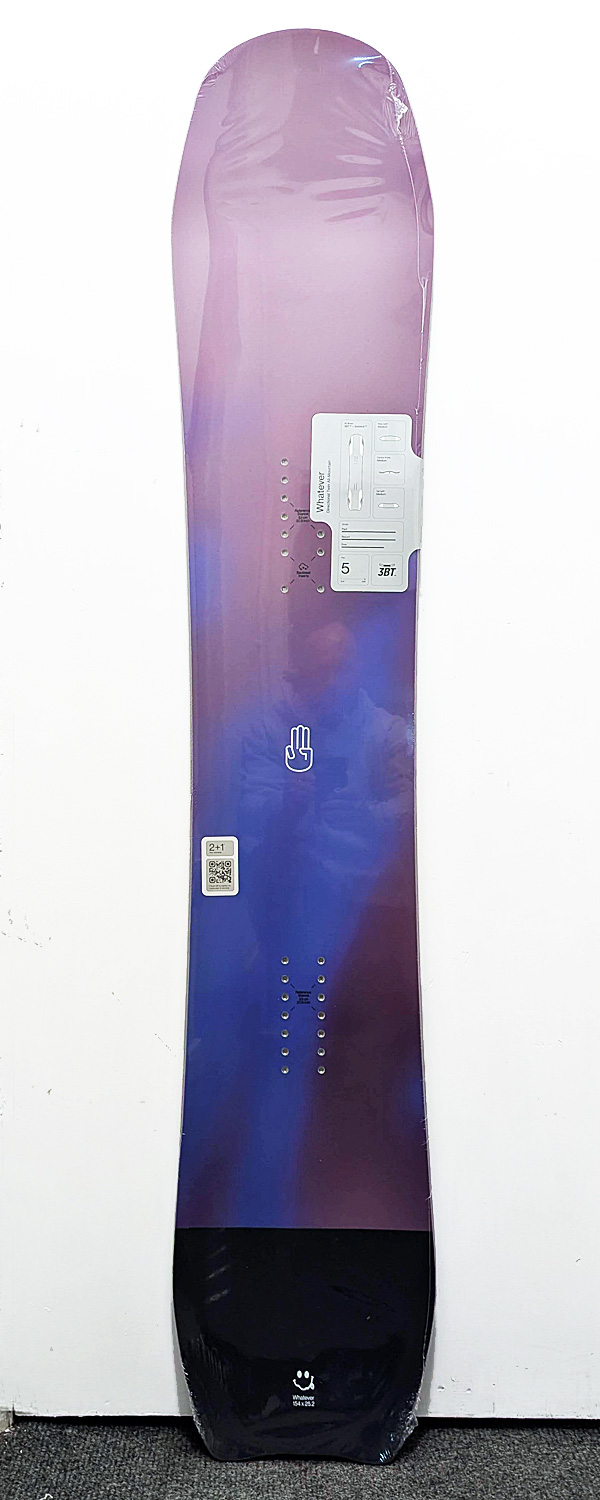 The Whatever’s outline looks strikingly directional, yet its contact surface is twin. It’s the ultimate board for those seeking the best of both worlds. Perfect for park days, hot laps, or powder lines, the Whatever embodies versatility.